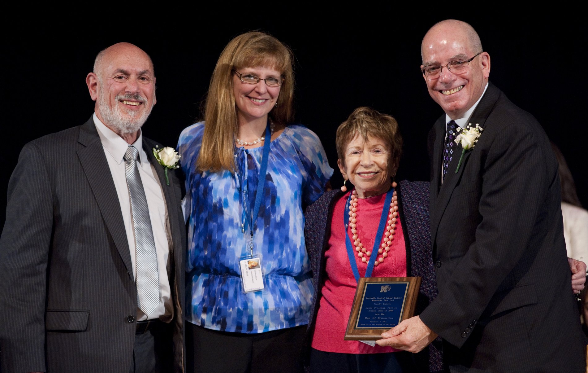 Sonia with (from l. to r.) Les Kristt, Wall of Distinction committee member and emcee of the event; Allison Ruef, communications specialist, Monticello Central School District; and Daniel Teplesky, Monticello Superintendent of Schools.